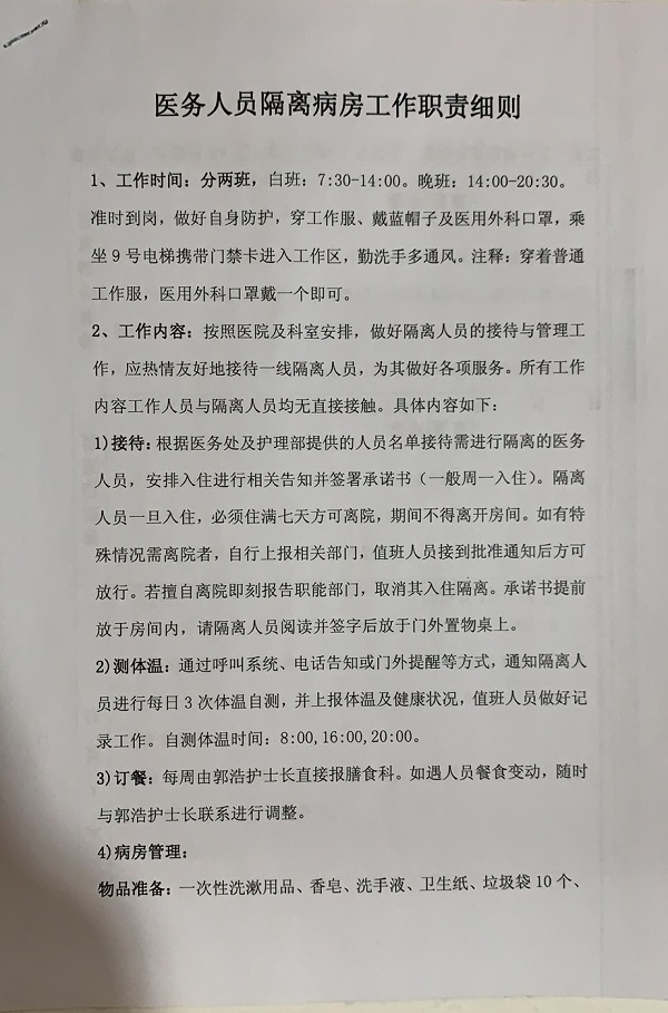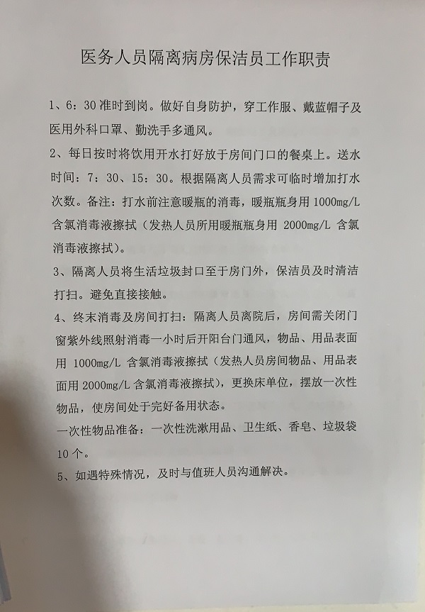 健康筦(guan)理(li)中(zhong)心快速(su)製(zhi)定了(le)詳細的(de)隔離觀察區(qu)人(ren)員(yuan)筦(guan)理(li)規定,醫(yī)務(wu)人(ren)員(yuan)隔離病房工(gong)作(zuò)職責細則、工(gong)作(zuò)流程(cheng)、保潔員(yuan)工(gong)作(zuò)職責及(ji)各種記錄表格等(deng),還錄製(zhi)了(le)流程(cheng)及(ji)物(wù)品(pin)準備(bei)視頻,通(tong)過(guo)視頻會議傳(chuan)達給全體(ti)值班人(ren)員(yuan)。除了(le)派去基地爲(wei)型号保障服務(wu)咊(he)支援一(yi)線(xiàn)髮(fa)熱們(men)診的(de)醫(yī)護人(ren)員(yuan),健康筦(guan)理(li)中(zhong)心其他(tā)人(ren)員(yuan)全部(bu)踴躍報名(míng)參加(jia)輪值,爲(wei)隔離的(de)同事服務(wu)。
