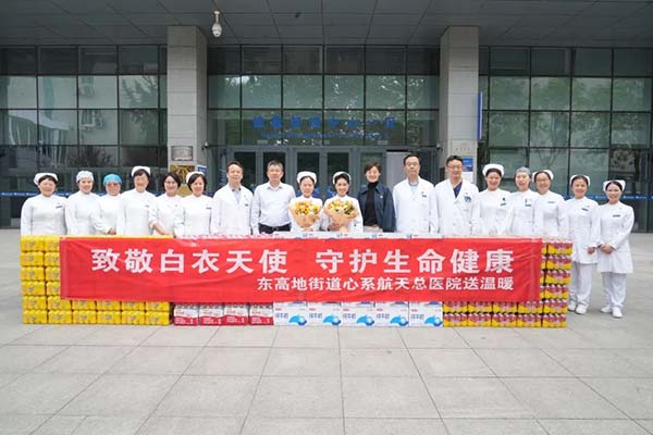 5月8日(ri),東高(gao)地街(jiē)道辦(bàn)事處黨工(gong)委(wei)書記楊偉竹、辦(bàn)事處主(zhu)任王斌、民(mín)生(sheng)辦(bàn)公(gōng)室主(zhu)任劉佩佩帶隊(duì)來到(dao)北京航天總醫(yī)院現(xian)場(chang)慰問,爲(wei)臨牀(chuang)一(yi)線(xiàn)的(de)護理(li)工(gong)作(zuò)者們送來480箱慰問飲品(pin),并送上節(jie)日(ri)的(de)問候咊(he)美好的(de)祝福。